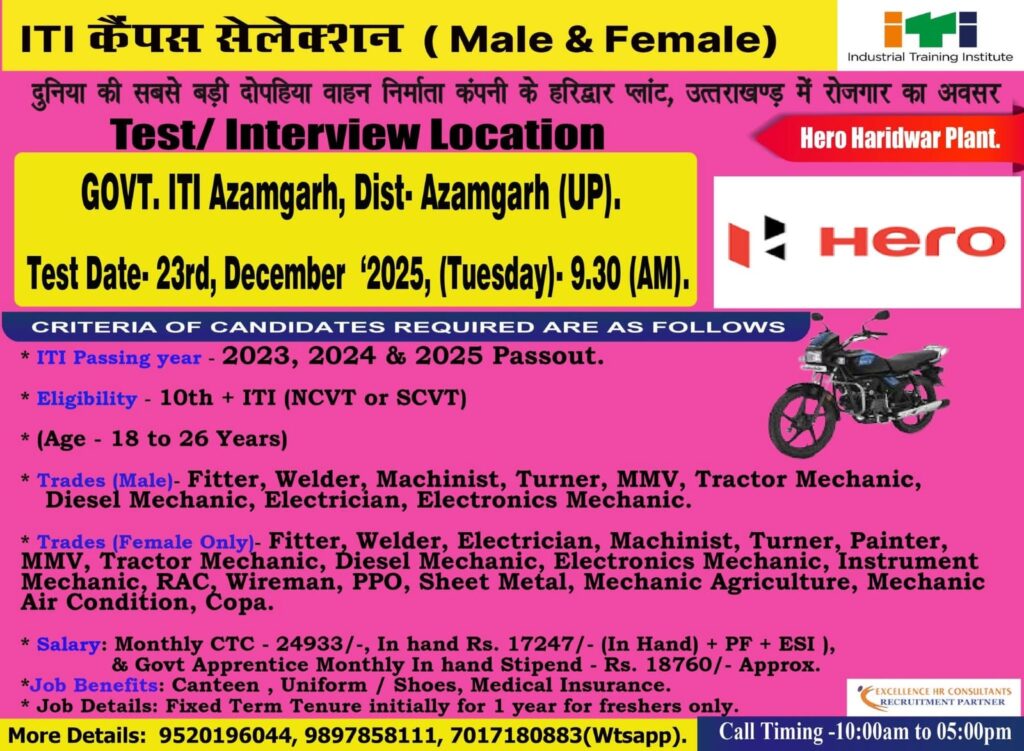 Exciting job opportunities are now available for young individuals who have completed their ITI. Hero MotoCorp, one of the largest two-wheeler manufacturers in the world, is looking to recruit at their Haridwar plant in Uttarakhand. This campus selection event will take place at Government ITI Azamgarh in District Azamgarh, Uttar Pradesh. Eligible candidates will be chosen through a written test and an interview.