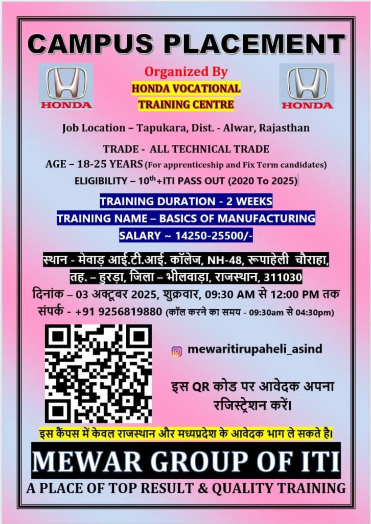 होंडा कर इंडियन प्राइवेट लिमिटेड कंपनी के कैंपस प्लेसमेंट में भाग लेने वाले अभ्यर्थियों को ध्यान रखना चाहिए कि इस कंपनी का कैंपस प्लेसमेंट 3 अक्टूबर 2025 को आयोजित की जाएगी इसके लिए आप मेवाड़ प्राइवेट आईटीआई भीलवाड़ा राजस्थान में मध्य प्रदेश और राजस्थान राज्य के कैंडिडेट से ही इस रोजगार मेले में भाग लेने के लिए जाए।